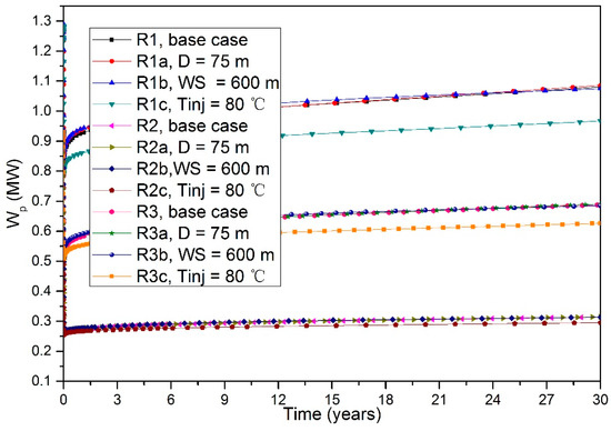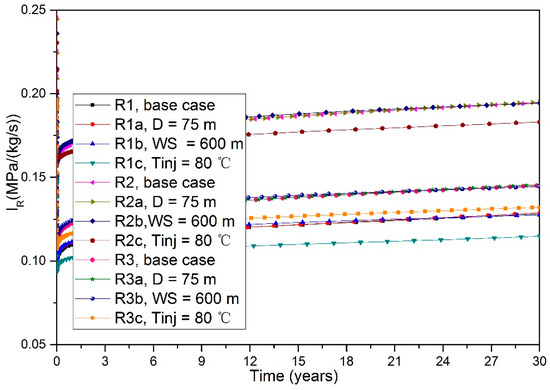 Figure 14 R1b shows that increasing WS from 500 m to 600 m results in an increase of We from 13.97–11.20 MW to 19.72–13.27 MW. For Figure 14 R2b and R3b, similarly we can find that the increase of WS will cause the rise of We. This is because higher WS increases the reservoir volume between the injection well and production well, thus increases the Tpro and hpro, according to Equation (11) this obviously increases the We. This proves that the WS is an important design parameter for EGS construction, it is directly related to the We, thus the determination of WS should be based on an accurate analysis of the geological data of the geothermal field. Figure 15 R1b shows that increasing WS from 500 m to 600 m results in only a very slight influence on the IR. For Figure 15 R2b and Figure 15 R3b, similarly we can find that the increase of WS has only a very slight effect on the IR. As stated above, the IR is mainly determined by water viscosity and reservoir permeability—the viscosity and permeability are independent of WS, thus it has only a very slight influence on the IR. Figure 16 R1b shows that increasing WS from 500 m to 600 m results in only a very slight influence on the Wp. For Figure 16 R2b and R3b, similarly we can find that the increase of WS has only a very slight effect on the Wp. This is mainly because the increase of WS has only a very slight on the IR, based on Equations (12) and (16), the increase of WS has only a very slight influence on the Pinj and Wp. Figure 17 R1b shows that increasing WS from 500 m to 600 m results in an increase of from 20.62–10.36 to 22.56–12.35. For Figure 17 R2b and R3b, similarly we can find that an increase of WS significantly increases the . As stated above, this is because the increase of WS obviously increases the We, while it has only a very slight effect on the Wp, based on Equation (17) this will increase the . Overall, the WS has a significant influence on the electricity generation performance, within a certain range, increasing the WS will significantly increase the We, while have only a very slight effect on the IR and Wp, thus significantly increase the .