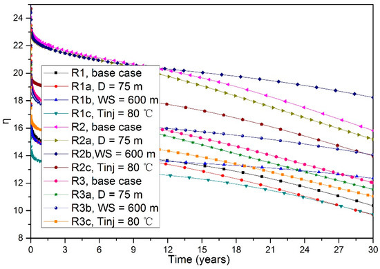 In the calculation of Equation (17), the water density is still taken as the average value of = 949.43 kg/m3. Figure 10 shows the change of the energy efficiency during the 30 years under the three reference cases. Based on Equation (17), during the heat mining because the and gradually decreases while the gradually increases, the energy efficiency gradually reduces, and this is in agreement with Figure 10. For the R1 reservoir, the is lowest and it decreases from 20.62 to 10.36. For the R3 reservoir, the is in between and it reduces from 23.13 to 12.04. For the R2 reservoir, the is highest and it decreases from 24.05 to 15.83. So, it can be found that with the increase of the reservoir heterogeneity—namely R1 < R3 < R2—the rises. Though the reservoir heterogeneity significantly reduces the water conduction ability of the reservoir, under a lower water production rate the system obtains a higher energy efficiency. These are in accordance with previous studies from Zeng et al. [4,5]. Though the heterogeneous reservoir can obtain higher energy efficiency, it decreases the water production rate and also electric power is reduced, thus the economic benefit of the heterogeneous reservoir is still lower than that of the homogenous reservoir.