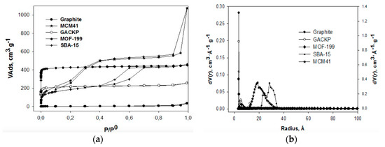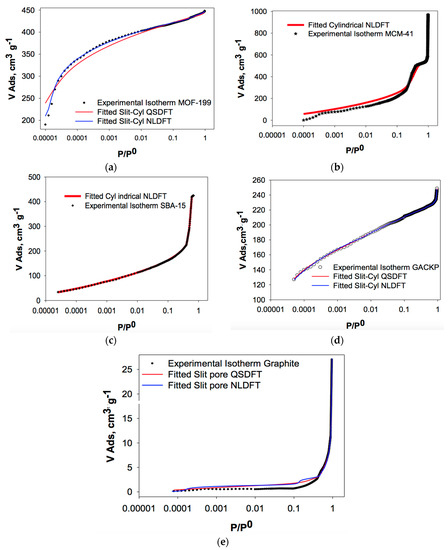 Porosity size distribution was performed using the Non-Local Density Functional Theory (NLDFT) and Quenched Solid Density Functional Theory (QSDFT) models, applying slit, cylinder and combined pore geometry. The results obtained with the AsiQWin software of IQ2 Autosorb (Quantachrome Inc. Boynton Beach, FL, USA) are shown in Figure 2a–e. The samples, in general, were more adjusted to the NLDFT model. The DFT models that adjusted better for each one of the studied samples taking into account the geometry pore were: for GACKP, QSDFT cylinder-slit geometry, while NLDFT describe better the experimental data of graphite, with slit pore geometry, SBA-15, and MCM-41, with cylinder pore geometry, and MOF-199, with a combined geometry (cylinder-slit). The sample that has a better fit to the QSDFT model is characterized by having rough and energetically heterogeneous surfaces, characteristic of activated carbons obtained from lignocellulosic waste, while NLDFT describes a geometric and energetic homogeneous surface, just as expected from the mesostructured silicas and the graphene layers of the graphite.