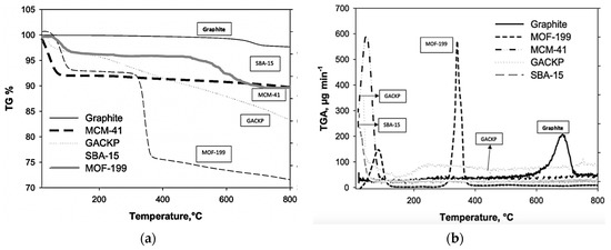 (a) TGA and (b) DTG of MOF-199, MCM-41, SBA-15, GACKP and Graphite.