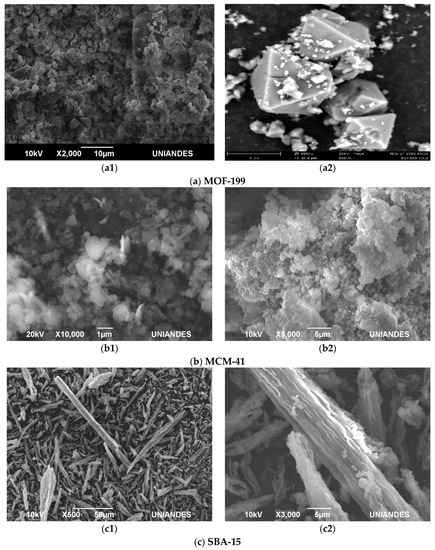 Figure 6(a1) shows the scanning electron microscopy (SEM) for the MOF-199 where there are some characteristics of small particles such as solids. In Figure 6(a2), as expected, the SEM micrograph for MOF-199 showed that a highly crystalline material was obtained (Figure 6a). The MOF-199 crystals in the SEM images have a double-sided pyramidal shape with a width of approximately 10–20 μm.