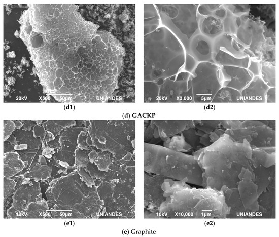 Figure 6d shows the SEM corresponding to the GACKP sample. The sample presents a well-developed porous structure with pores of different sizes, which allows verifying that it has heterogeneous textural properties as analyzed in the previous section. In Figure 6(d1) the characteristic porosity of an activated carbon prepared under the conditions of this investigation was clearly observed. In Figure 6(d2) (magnified), clearly developed pores were seen.