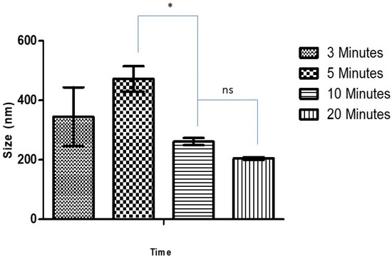 Effect of sonication time on size of blank CSNP; * significant difference with CSNP size at 5 and 10 min sonication (p < 0.05); ns, non-significant.