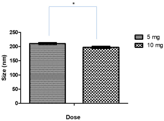 Effect of drug loading on size of CSNPs; * significant difference between 5 mg and 10 mg loading (p < 0.05).