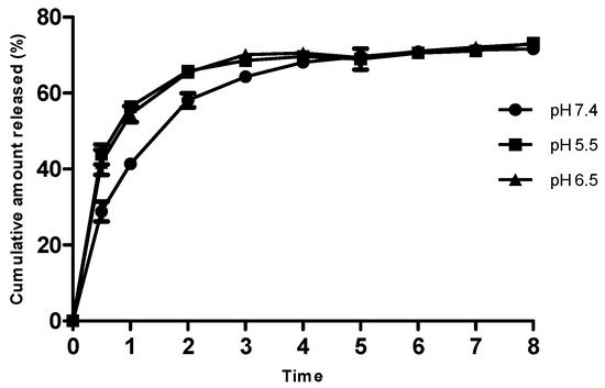In vitro release profile of Ag-FSE CSNPs at pH 7.4, 5.5 and 6.5. Data are expressed in mean ± SD (n = 3).