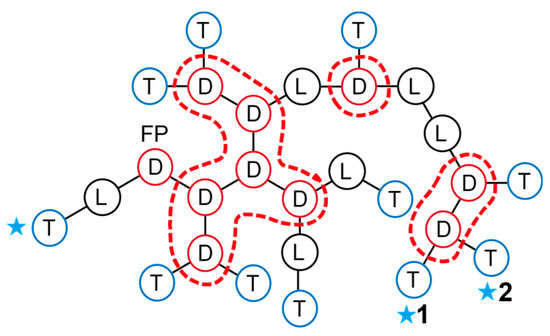 Schematic representation of a hyperbranched (HB) polymer molecule generated in the present Monte Carlo (MC) simulation for a continuous stirred-tank reactor (CSTR). The tri-branched clusters are shown by the red closed curves, and the T units with a star show the end units for the maximum span length.