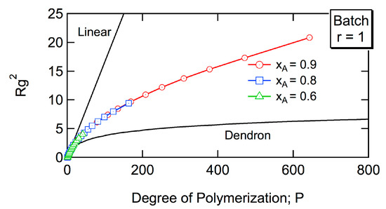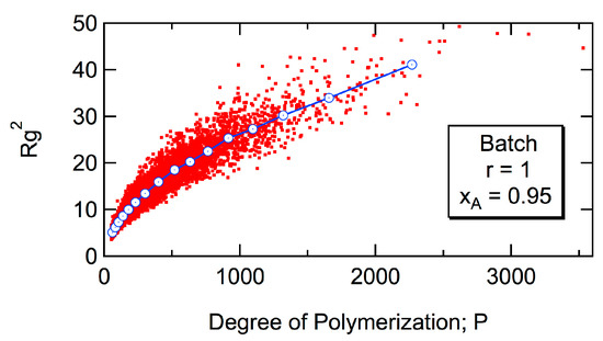 Both Rg2 defined by Equation (5) and the maximum span length LMS exemplified in Figure 2 are the characteristic factors describing the spatial size of an HB polymer. In this section, the universal relationships concerning Rg2 and LMS are explored both for a batch (Section 3.2.1) and a CSTR (Section 3.2.2).