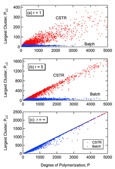 Relationship between the number PLC of units belonging to the largest cluster and the degree of polymerization P. (a) r = 1; ξ = 0.5 for CSTR, and xA = 0.95 for batch. (b) r = 5; ξ = 0.306 for CSTR, and xA = 0.95 for batch. (c) r = ∞; ξ = 0.25 for CSTR, and xA = 0.95 for batch.