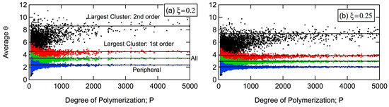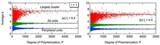 Figure 6 shows the relationship between the number of units PLC belonging to the largest cluster and the number P of units in the polymer molecule (degree of polymerization). Each dot shows a set of values for each polymer molecule generated in the MC simulation. For a CSTR, the cases with ξ = ξUL are shown in the figure, while xA = 0.95 for batch polymerization. General characteristics were the same for the other reaction conditions. For a CSTR, the largest cluster size PLC increases with P, and a very large tri-branched cluster exists in a large polymer molecule. On the other hand, the size of the largest cluster does not increase significantly for batch polymerization, except for r = ∞. With r = ∞, all units other than the peripheral T units and a focal point are tri-branched units, and the largest cluster size is essentially proportional to P with PLC ≈ 0.5P. Except for r = ∞, the existence of a large cluster of tri-branched units is an important characteristic of polymers formed in a CSTR, while a large number of small-sized clusters are formed in batch polymerization. It is reasonable to consider that the dimension is smaller for the HB polymers formed in a CSTR. The cases with r = ∞ will be discussed later, and consider the properties of various types of clusters for the cases with the reactivity ratio, r ≤ 5 first.