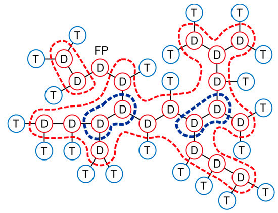 Example of the hyperbranched polymer architecture generated in the present MC simulation for a CSTR with r = ∞ and ξ = 0.2. The tri-branched clusters of the first order are represented by the groups enclosed by the red broken curves, while the tri-branched clusters of the second order by the blue broken curves. For this polymer, P = 43, D = 21, and DB = 1.