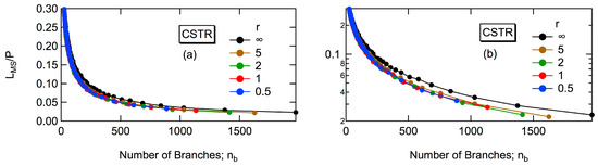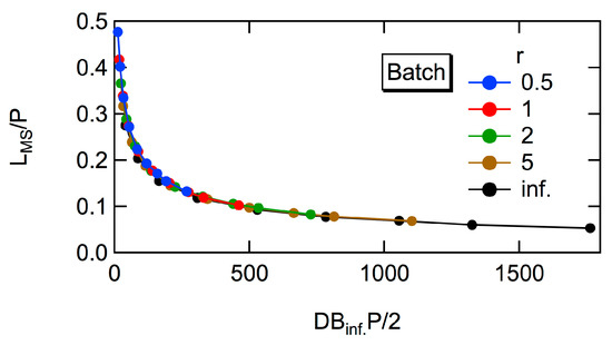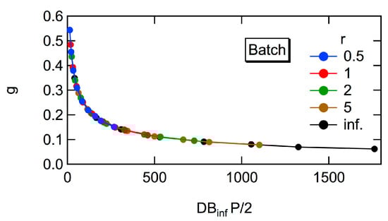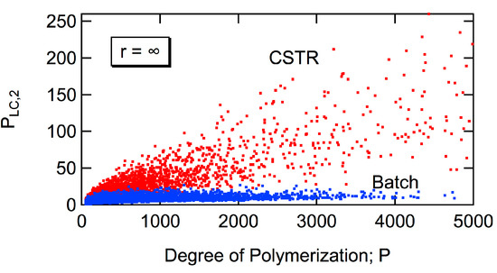 An interesting characteristic of DBinf is that the magnitude of DBinf is essentially kept constant, irrespective of the conversion level for a given reactivity ratio r, both for a batch reactor [6,7] and for a CSTR [8,9]. Note that the average DB of the whole reaction system increases with conversion, but DBinf does not change. The value of DBinf can be estimated by the reactivity ratio r, as shown in Figure 4. Obviously, DBinf = 1 for the cases with r = ∞, both for batch and CSTR, but the value of DBinf for a CSTR is always larger than that for a batch reactor, as long as r is finite. Incidentally, analytic relationship between DBinf and r was established previously [6,7], and a smooth curve was drawn for batch polymerization in Figure 4. On the other hand, a general equation for a CSTR has not been reported, and five data points reported in the earlier publication [9] were plotted and connected.
