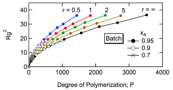 Figure 12 shows the expected Rg2-values that correspond to the blue curve in Figure 11 for various combinations of the reactivity ratio r and conversion xA. The curve for the expected Rg2-value does not change with the conversion level xA, and becomes smaller as the reactivity ratio r increases, as already reported earlier [6,7].