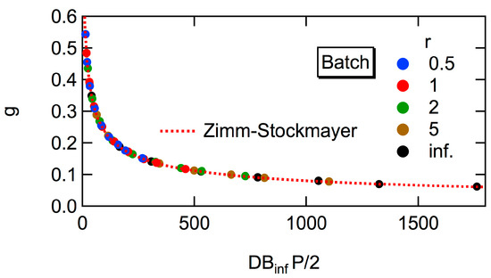 Figure 14 shows the comparison with the Zimm-Stockmayer equation by using , which shows an excellent fit. It is suggested that the HB architecture formed in a batch polymerization is random branch, irrespective of the magnitude of reactivity ratio, r. In batch polymerization, the probability that a randomly selected unit from the final product is the D type unit is the same for all units [6,7], and therefore, it is reasonable to obtain HB polymers with random branched architecture. On the other hand, in the case of a CSTR, the probability for a randomly selected unit from the final product being the D type unit is larger for the units with longer residence time, leading to a nonrandom branched architecture, as discussed in the previous section.