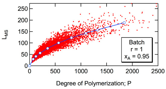 Next, consider the maximum span length, LMS. Figure 15 shows the MC simulation results for the relationship between LMS and P with r = 1 and xA = 0.95 for batch polymerization. Each red dot represents a set of LMS and P, generated in the MC simulation. Blue circular symbols show the averages within ΔP fractions, and the blue line connecting these points represents the expected LMS-value for a given P.