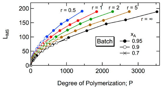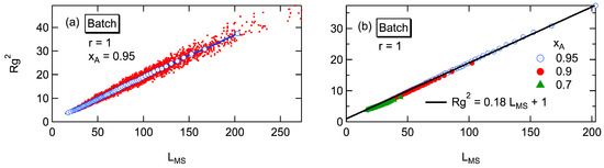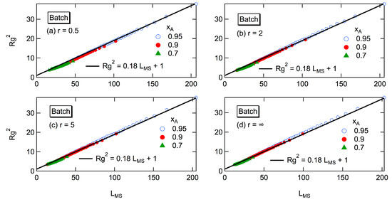 Figure 19 shows the expected Rg2 for a given LMS, for various combinations of xA and r. A linear relationship seems to hold for any value of r. The black straight line shows the linear relationship given by Equation (12). Although a slight discrepancy is observed in the cases of r = 5 and ∞ for large polymers, the data points are well correlated with Equation (12). Equation (12) is the universal relationship between Rg2 and LMS, applicable to any combination of r and xA in batch polymerization.