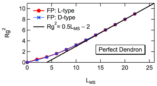 Relationship between Rg2 and LMS for perfect dendrons, when the focal point is the L-type (red circle) and the D-type (blue cross). For both cases, the relationship is represented by Equation (14) for large polymers.