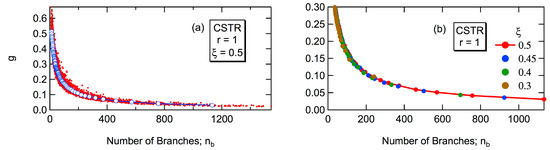 In this section, basic characteristics of Rg2 and LMS are considered, as was done in the previous section. For a CSTR, however, the variance of Rg2 for large polymer is quite large [8,9], and it is difficult to determine the statistically valid expected Rg2-values for large polymers. Inspired by the universal curve shown in Figure 13, the value of g-ratio defined by Equation (9) is plotted with respect to the number of branch points in a polymer molecule, nb. Figure 21a shows the case with r = 1 at ξ = 0.5. In the figure, each red dot indicates a set of values for the polymer molecule generated in the MC simulation. With this type of plot, the variance of g for large polymers is rather small, and it is straightforward to determine the expected g-ratio for a given nb, shown by the blue curve with circular symbols.