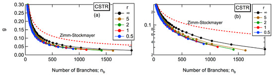 Expected g-ratio and nb for the HB polymers having nb branch points in a polymer with various reactivity ratio r for a CSTR. The plotted values are at ξUL for each r. (a) Normal scale plot, and (b) logarithmic scale plot for the y-axis.