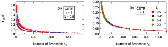 Next, consider the maximum span length, LMS for the HB polymers formed in a CSTR. Figure 23a shows the relationship between the weight fraction of the maximum span chain LMS/P and nb for r = 1 with ξ = 0.5. Each red dot shows the individual data point, and the blue curve with circular symbols shows the expected value of LMS/P for a given nb. Figure 23b shows the expected LMS/P for various values of ξ, i.e., for different conversion levels at steady state. The expected values of LMS/P do not change with ξ, and another universal relationship is found. The universal relationship between LMS/P and nb, unchanged by ξ, is confirmed also for the other r cases, as shown in Figure S2 of Supplementary Materials.
