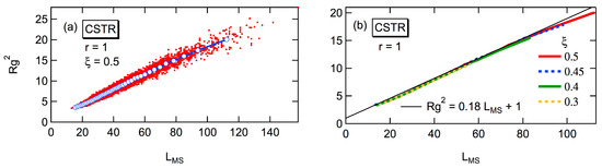 Figure 25a shows the relationship between Rg2 and LMS for HB polymers formed in a CSTR with r = 1 and ξ = 0.5, which shows a linear relationship. Figure 25b shows the expected Rg2 at various ξ-values for r = 1. The relationship is essentially unchanged by the steady-state conversion level. The black line represents the relationship given by Equation (11). Although a slight deviation is observed for large values of LMS, overall agreement is satisfactory. Compared with Figure 18, the absolute values of Rg2 and LMS are smaller for the case of CSTR, because of much more compact architecture formed in a CSTR.