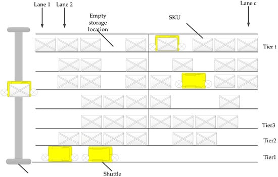 Figure 1 demonstrates the design of a tier-to-tier SBS/RS. Here, shuttles transport the stock keeping unit (SKU) horizontally in each tier. Lifts placed at the end of each aisle are used for vertical transport. Additionally, shuttles can access any tier of the rack with the help of lifts. The shuttle buffer is at the bottom tier for resting shuttles when they complete tasks. This paper focuses on the performance with a single aisle, since there are similarities between aisles.