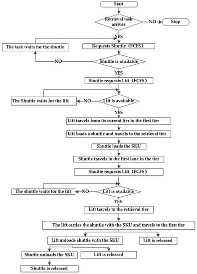 Figure 2 shows the retrieval operation of an SBS/RS with a flowchart, where First Come First Served (FCFS) policy is used. A principal computer locates the aisle, tier, and column of the SKU based on the retrieval task. There are two situations: Firstly, if there is an idle shuttle, the principal computer will automatically assign an idle shuttle to the task. Secondly, if all shuttles are under tasks, the order will be listed in the waiting sequence. Next, when the idle shuttle gets the task, it will request the lift immediately, which will be put into the lift waiting sequence. Similarly, an idle lift will respond. In detail, a lift moves from the current position to the first tier, then the shuttle gets into the lift. The lift conveying the shuttle moves to the tier where the SKU locates, and the lift is released for other tasks after the shuttle has left. Shuttles start from the first column in one tier to the position where the SKU is located and go back to the initial location, requesting the lift service. Similar to the first request for lifts, the task waits in the line of lift tasks. The idle lift transports the loading shuttle to tier 1 and it is released for further tasks when the shuttle has left. The shuttle is free for the next task after unloading.