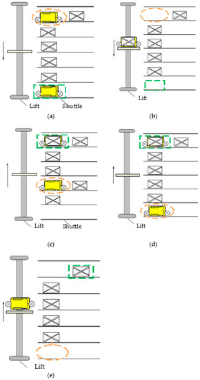 The primary objective of task scheduling is to reduce the waiting time between shuttles and lifts. In other words, each retrieval task consists of one shuttle and one lift, and a lift works with idle shuttles and loading shuttles once, respectively. Thus, when we model the task scheduling, in order to decrease the waiting time of each order, we categorize the lift request for a retrieval task into two phases: fetching idle shuttles and fetching loading shuttles. Moreover, essential operations of the lift are classified into five categories, as shown in Figure 3. Figure 3a,b represents the movement of the idle and loading shuttles, respectively, from tier i to tier 1. Under the assumption of constant velocity of idle and loading shuttles, both situations can be combined as the movement of lifts from tier i to tier 1. Figure 3c shows the movement of a lift from tier i to tier j (may be idle in practical situations). Figure 3d,e illustrates the movement of the idle lift and shuttle from tier 1 to tier i.