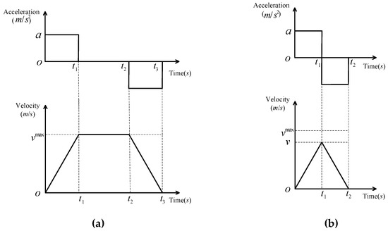 - If shuttles and lifts reach the maximum velocity before deceleration, the operation includes three steps: accelerating from 0 to maximum velocity , traveling at , and decelerating from to 0. The patterns of acceleration and velocity are shown in Figure 4a.