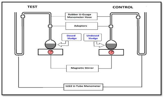 Two quantities of 2-L flat round-bottom flasks were used as the laboratory digester for both the Fe3+- and Al3+-dosed samples alongside their respective controls. The two bioreactors (digesters) containing the SAS were made up of one as the test (chemical-dosed sludge) and the other as the control (Figure 1). As a control, 1500 mL of SAS was measured without chemical and transferred into the first flat round-bottom flask. To give it some organic carbon, 20.5 g of sucrose was added, which facilitated readily degradable carbon, and a magnetic stirrer was used to give it slow stirring to promote uniformity of the sample in the digesters. From the anaerobic sludge tank, 40 g of sludge was used for bioaugmentation to enhance and speed up the microbial activities. They were also flushed with nitrogen gas to ensure anaerobic conditions. The second flat round-bottom flask containing the same sample was then pretreated with 200 mL of 100 mg/L as Fe3+ solution. The experiments were also repeated with 100 mg/L as Al3+ solution. Initial jar tests showed that phosphorus levels were reduced to <0.5 mg/L between 50 and 100 mg/L doses of the metal salts. The maximum dose of 100 mg/L was then chosen for the digestion experiments. The test and control sludge samples were digested at mesophilic temperatures (35 °C) for 12 days until the biogas production subsided. The temperature of digestion was maintained at 35 °C throughout the experiment as most mesophiles grow best within the temperature range of 30–35 °C []. The experiments were repeated twice, and average data are reported. The digestibility of the test and control sludge was evaluated by measuring the biogas volume using a manometer (Dwyer flex-tube series 1222 U-tube manometer containing red gauge fluid, Michigan, USA).