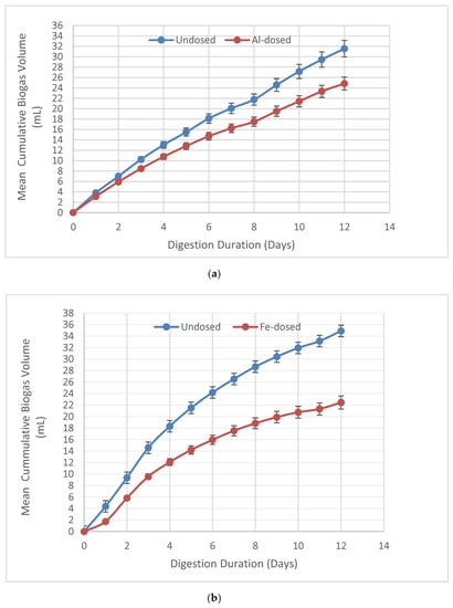 The reason for this high rate of biogas production in undosed sludge compared with the metal (Al3+ and Fe3+)-dosed sludges may be attributed to the increased availability of the substrate for metabolism and possibly due to the microbial community in the seeded sludge being more susceptible to breaking down undosed SAS compared with aluminium- and ferric-dosed SAS. The reduced biogas production for the Al3+- and Fe3+-dosed sludges can also be due to the substrates, such as proteins, that form the majority of the components in the sludge (SAS) being tightly bound to the surface of the Al3+-dosed sludge precipitate and Fe3+-dosed sludge being entangled within the sludge floc []. It has been suggested that the reduction in biogas volume of Al3+-dosed sludge compared with undosed sludge may be due to the time length of producing and hydrolysing the substrate []. Further, the strong bond of proteins to aluminium may cause a reduction in the rate of biogas production []. It has also been inferred that the biogas reduction may be attributed to the reduced availability of microbial population to organics [,].
