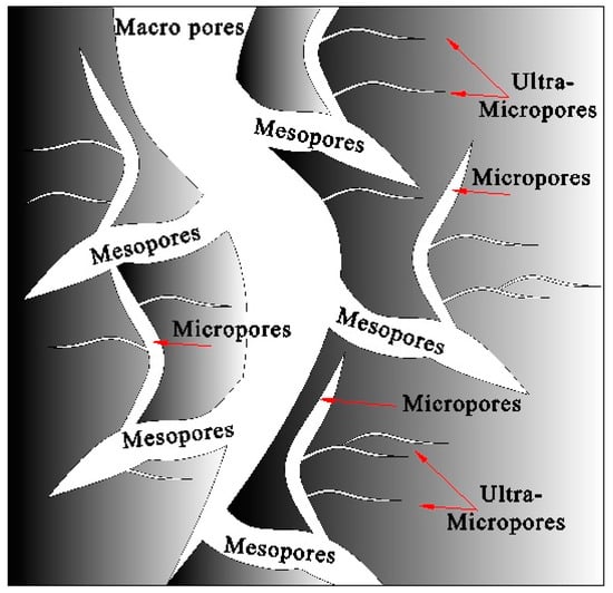 Pores are classified according to their size []. Table 3 classifies different types of pores along with their sizes. The pores are interconnected, as shown in Figure 5, and are the sites for electrochemical hydrogen storage. The major amount of hydrogen stored in solid state is in ultramicropores [].