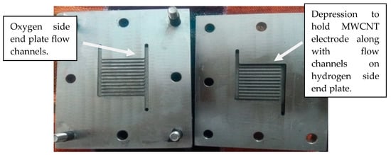 The bi-polar end plates of modified URFC, shown in Figure 7, are generally made up of metals such as stainless steel, titanium, or metallic alloys. The end plates should have high thermal conductivity, high electrical conductivity, high resistance to corrosion, low permeability to gas, high mechanical strength, and low mass. Stainless steel metallic (SS316) plates are widely used for research activity because they have low cost, ease of manufacturing, high thermal and electrical conductivity, and good mechanical properties. The end plate contains header and flow channels that provide path for oxygen flow to the oxygen side of the membrane and the removal of hydrogen to other side. The flow channels present on both the anode and cathode side end plates were of serpentine design and were identical except for the number openings in the headers. The oxygen side end plate or anode end plate consisted of three openings in the header—one for water inlet, one for oxygen gas outlet, and the third one for oxygen gas inlet, required while discharging the cell. On the other hand, the hydrogen side end plate or cathode end plate had two openings in the header—one for the hydrogen gas outlet and another for the hydrogen gas inlet, if required to enhance the reaction rate while discharging. The active area for activated carbon and electrode assembly was 25 × 25 mm. The end plates on both sides had the same dimensions (i.e., 72 × 84 mm), but varied in thickness. End plate on the hydrogen side was 9 mm thick to accommodate the electrode, whereas the oxygen side end plate was 7 mm thick. The flow channel plays an important role in proper and even circulation of reactant gases on the electrode, as well as in the removal of water from the electrode []. Figure 7 shows the oxygen and hydrogen side end plates along with their flow channels.
