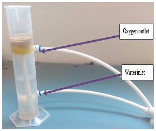 The production of oxygen started when water was subjected to cut-in voltage of 1.5 V, as shown in Figure 14 and Table 9. The oxygen produced was stored in the gas collection cylinder and its production increased with the rise in the voltage. The higher the applied voltage, the higher would be the charge flow through the circuit, leading to the increase in the production of oxygen ions that combine to form oxygen gas and release electrons in the presence of the catalyst. This was verified through Faraday’s law given in Equation (1).