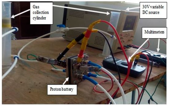 The experimental setup of the modified URFC or proton battery is shown in Figure 10 along with schematic diagram in Figure 11. The oxygen side of the proton battery had three outlets, two for oxygen and one for water intake. On the hydrogen side, there were two vents for extraction of hydrogen gas. In the process of electrolysis, the water inlet was connected to the lower vent of the anode side end plate, oxygen was collected from the upper vent, and the third vent was blocked. On the hydrogen side, the upper vent was used as hydrogen outlet, whereas the bottom vent was blocked. A variable 30 V DC source was used to supply electric charge in the case of electrolyzer mode of the modified URFC. Two multimeters were used to measure the voltage across and current through the cell.