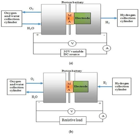 (a) Schematic diagram of charging mode of the modified unitized regenerative fuel cell (URFC) or proton battery; (b) schematic diagram of discharging mode of modified URFC or proton battery.