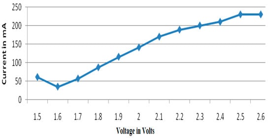 During galvanostatic charging, the voltage was increased by 0.1 V in an interval of thirty minutes. From Figure 12, it can be inferred that current increased with voltage. The maximum rise in current observed was 230 mA. At 2.6 V, the charging process was stopped due to the sudden increment in production of hydrogen gas, indicating that the storage was full (i.e., the hydrogen ions that were emerging on the membrane were combining with electrons to form hydrogen gas, instead of entering into the storage electrode). The sharp dip in the curve, as shown in Figure 12, was due to the electric potential predominantly being utilized for water disassociation. Once the electric potential reached a value that was enough to break the inter-molecular forces associated with hydrogen and oxygen in water, the current started rising (refer to Figure 12 and Table 7).