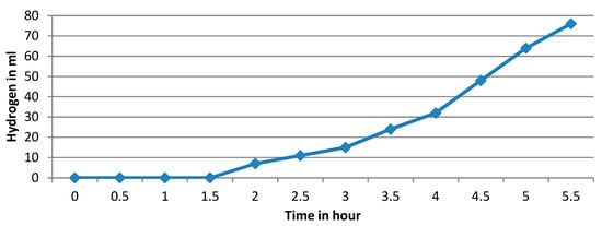 Voltage was increased after specified time intervals that lead to an increase in current and, hence, the production of hydrogen ions. For the first 1.5 h of charging, no hydrogen gas generation was observed in the collection cylinder. However, the cut-in voltage (i.e., where current starts rising after the dip shown in Figure 12) of 1.5 V resulted in generation of oxygen gas, which was observed in the form of bubbles in the collection cylinder (shown in Figure 9). It was deemed that the corresponding hydrogen got absorbed in the electrode and there was no visible sign of hydrogen generation. Figure 13 represents the hydrogen generation rate during charging of the cell. It is clearly visible in the figure that the cut-in voltage was reached at 1.5 V in 1.5 h, after which the dissociated hydrogen moved out of the cell and bubbled through water in the collection cylinder. Although the presented work aims to suppress the formation of hydrogen gas, practically not all the emerging H+ ions on the electrolytic membrane get adsorbed in the storage (i.e., certain H+ ions do combine with e– and liberate as H2). A fairly linear behavior of the hydrogen gas generation rate (i.e., the slope of curve in Figure 13) was observed with respect to increase of the applied voltage and corresponding current, as is clear from Figure 13 and Table 8.