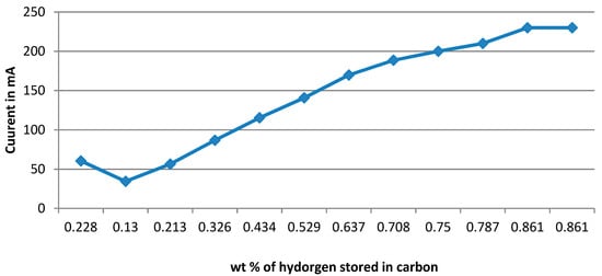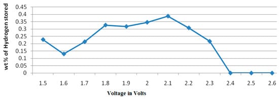 The weight percent of hydrogen was calculated for successive time intervals of 30 min, and its variation with respect to the applied current is shown in Figure 15 and Table 10. The initial plateau in the curve signifies the amount of electric potential that got invested in overcoming the inter-molecular forces of H2O and; therefore, lead to lower hydrogen storage, as shown in Figure 15. Once the water started disassociating, a linear increase in hydrogen storage with respect to the applied voltage was observed. Another plateau between 1.8 and 2.1 V was due to the saturation of the storage space and, finally, after 2.1 V, a clear drop in the curve could be seen that signifies that storage is almost full, thereby increasing the H2 generation rate rapidly.