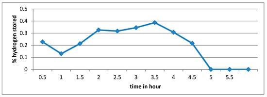 The graph between hydrogen wt% stored in MWCNT with respect to time is shown in Figure 17 and corresponding values are presented in Table 12. The maximum percent of hydrogen stored in carbon was 0.387% after 3 h of electrolysis. The possible reason for decay in hydrogen storage in MWCNT is that its pores get filled after a certain time. Since the voltage was applied at time (t) = 0 and the applied voltage was increased with respect to time, that is why the shape of curves in both Figure 15 and Figure 17 were the same, which, thereby, justifies the authenticity of the obtained results.