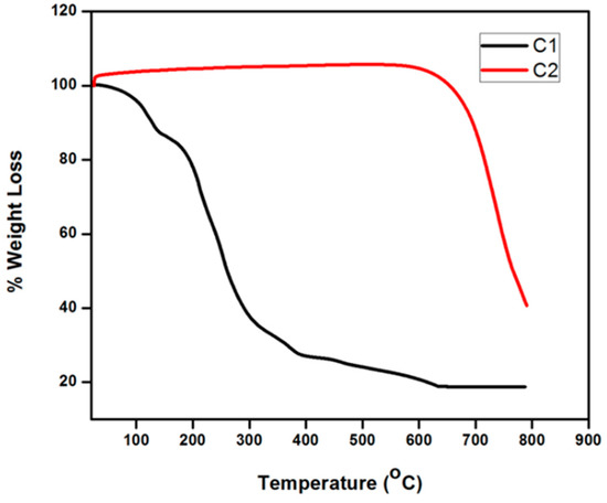 Thermo gravimetric Analysis (TGA) curves of Polyethylene Glycol (PEG)-capped particles with ethanol before washing (C1) and after (C2) washing.