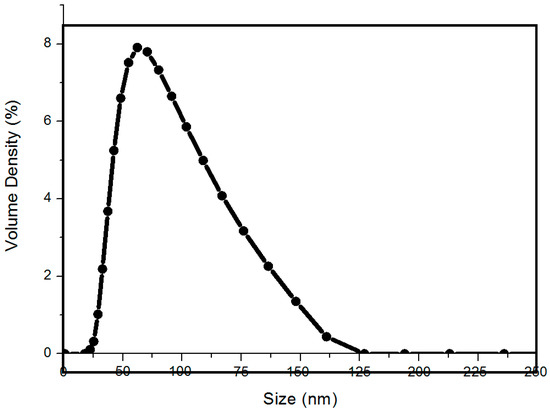 PSA was done on silver nanoparticles by forming a liquous solution in distilled water. Nanoparticles showed narrow particle size distributions with the majority of particles in the range 50–70 nm (Figure 3).