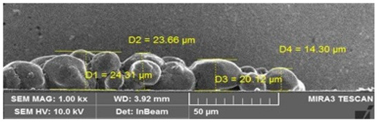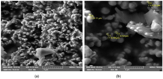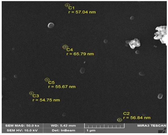 In order to find the exact size, the resolution was further enhanced and the film was observed at 1 µm (Figure 5c). The particles linked with one another but the viscosifying solution was also seen. The particles’ radii were found to range between 51 ± 2 and 57 ± 2 nm and some particles lost their circular identity after agglomeration with other nanoparticles. Thus, irregular structures were formed.