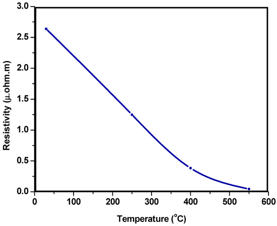 There was an inverse relationship between resistivity and temperature, demonstrating that by increasing the temperature there was a drop in the resistivity value. Figure 11 shows the same behavior as the value of resistivity diminished and the temperature rose. The minimum resistivity obtained was 0.04485 × 10−6 Ωm (4.485 × 10−6 Ωcm). Finally, the resistivity value obtained in this research was found to be comparable with the previous reports of silver nanofilms approaching bulk silver (about 1.6 × 10−6 ohm·cm) [10,22]. This behavior can be ascribed to an enhanced agglomeration at elevated temperatures that led to the interconnections required for the charge carriers to flow causing the resistivity value to drop.