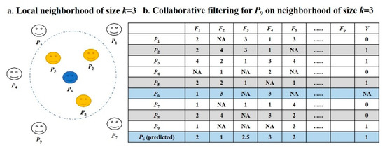 In contrast to traditional machine learning, where clinical prediction problems are treated as a supervised learning task, CF recasts a supervised learning task as an unsupervised problem. In the execution of CF using clinical data, the response variable Y is treated as another predictor, FP+1, with patient similarity as the prediction being made. There are disadvantages in methods, based on neighborhood similarity. First, such methods will lead to a larger error of similarity calculation and be incomputable. Second, the classifier tends to output multicategory results when the disease category itself is unbalanced in the dataset. In our applications, the selection of the number of neighbors, k, was made based on a 3-fold cross-validation. The implementation of CF was performed using recommender lab in the R programming language (https://www.r-project.org) [53].