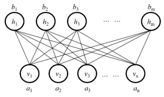 The RBM [13,14] is an undirected generative graphical model, with two layers that use a layer of hidden variables to model a distribution over visible variables. It is derived from the Boltzmann machine, a type of depth probability graph model, where the vertex represents random variables and the edge represents the interdependence of the variables. The RBM has two layers: A visible layer that consists of input variables and a hidden layer, which consists of hidden variables. In the visible layer node-set V, v represents visible units v = {v1,…,vn}∈V, n represents the number of neurons, and vi indicates the value of the ith neuron. Similarly, in the hidden layer node-set H, h represents hidden units h = {h1,…,hm}∈H, m represents the number of neurons, and hj indicates the value of the jth neuron. The two layers are fully interconnected, but no connections exist between any two hidden units or any two visible units, consequently forming a complete dichotomy, as shown in Figure 2. This provides a good hypothetical condition for our later training, that is the neurons in the same layer are independent of each other.