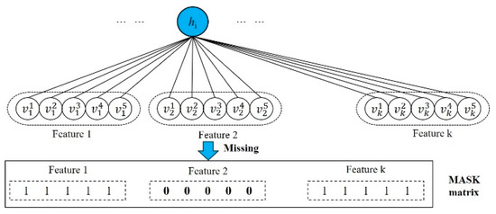 RBM-based CF for clinical diagnosis is mainly divided into two parts: Training model parameters and the reconstruction input layer. In the previous data pre-processing, we discretized continuous attributes and recast them into category attributes using the characteristics of medical datasets with a variety of features. For the traditional RBM model, all units are binary neurons, and the characteristics of datasets are all transformed into numerical category attributes; therefore, we considered the use of the common one-hot coding method. We processed all features with one-hot coding, which transforms each sample into a binary vector. The vector is the input of the visual layer, in which each sample with a missing value is given a default value of 0 and retains the mask matrix with the same dimension of the transformed binary vector. The mask matrix used to record the one-hot coding location of missing features is shown in Figure 3: