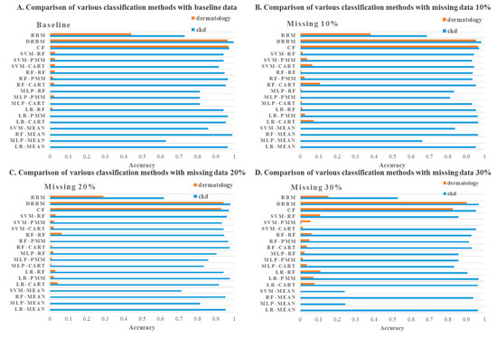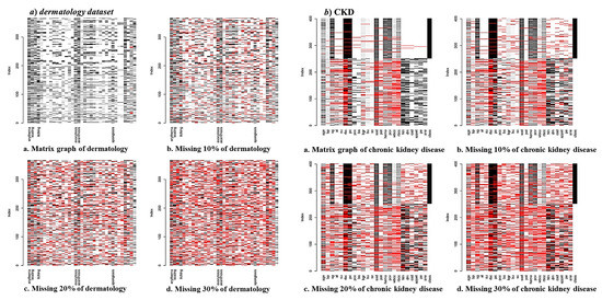 The matrix graph of the dermatology dataset and CKD, with varying degrees of missing data, are drawn in Figure 5. The matrix graphs with the original and missing values show that each row represents instance data, and the numerical data are rescaled to the interval from 0 to 1; the size is represented by grey scale. The deeper colours indicate that the value of the instance related to the value of the feature is large, and vice versa. Red indicates missing values. Only one attribute of the baseline data has several missing values. As seen from the missing datasets of 10%, 20% and 30%, the red area is gradually enlarged and is evenly distributed, which indicates that the created random missing dataset is of good quality. The matrix graph of the CKD dataset (as Figure 5b), the degree of missing data of the real datasets is nearly 8%. Almost every instance has a missing value in the datasets, with levels of missing data of 20% or more.