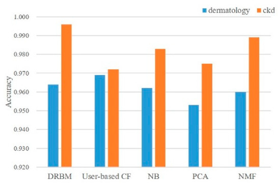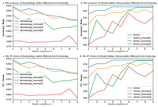 In this section, we apply the user-based CF model to conduct experiments, with the dermatology and CKD datasets, and the corresponding missing dataset created from them. The experimental results are shown in Figure 6.