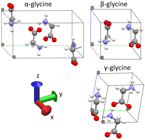 - Iitaka, Y. The crystal structure of γ-glycine. Acta Crystallogr. 1958, 11, 225–226. [Google Scholar] [CrossRef]
