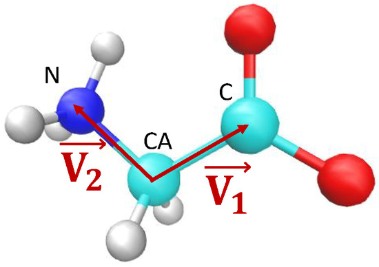 Glycine zwitterion. is a vector that connects the CA and C atoms within the molecule, and is a vector that connects the CA and N atoms within the molecule.